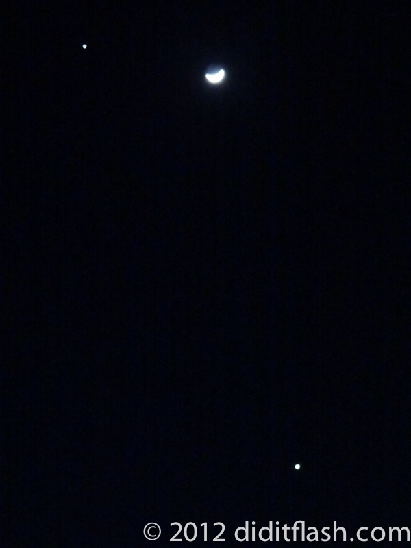 Posted on March 3, 2012Venus, Jupiter and the Cresent Moon Venus, Jupiter and the Cresent Moon Day 110 – A photo taken earlier this week. I tried to capture this celestial alignment. It was a beautiful sight. Jupiter is at the top of the frame and Venus is near the horizon.